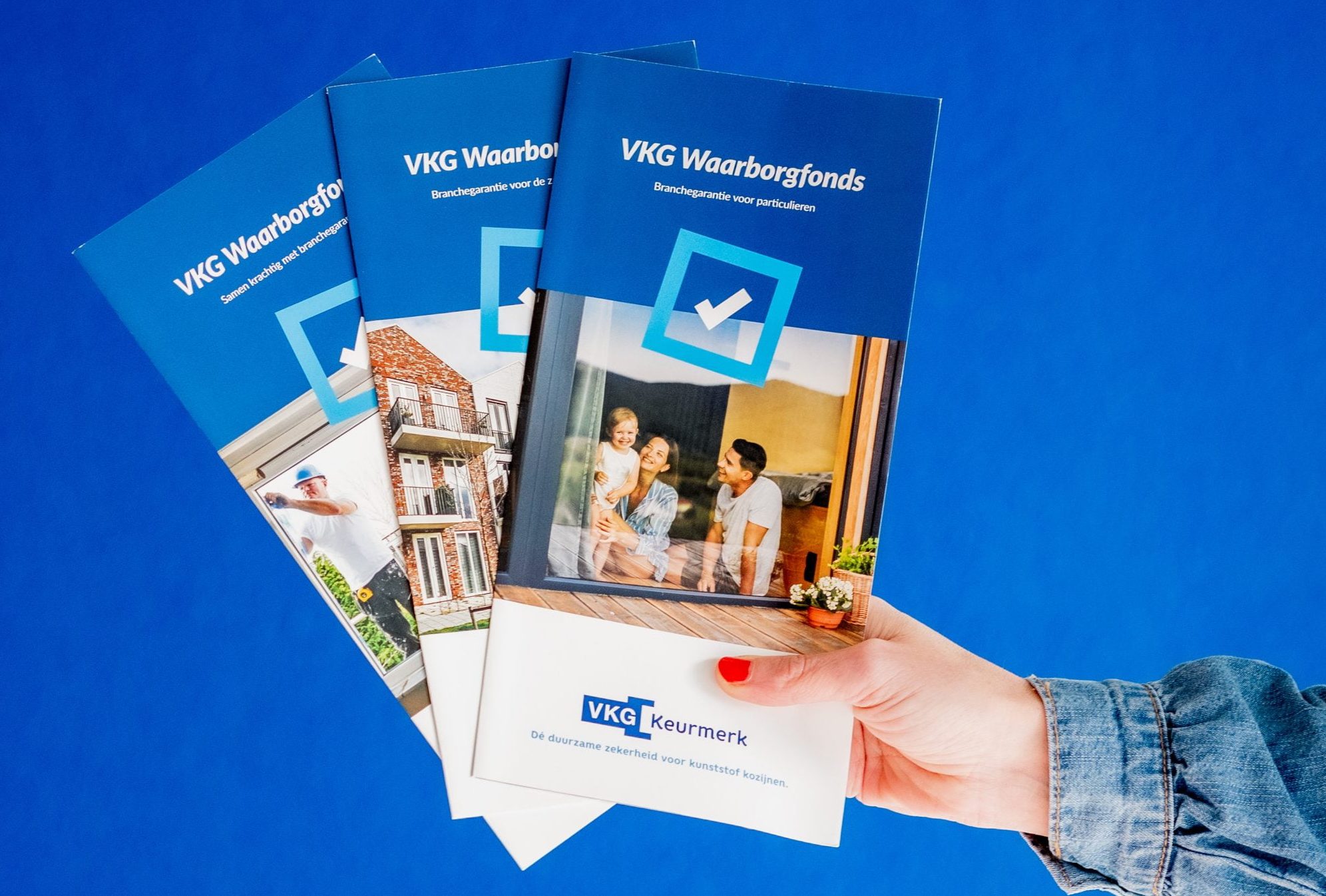 Er zijn veel communicatiemiddelen gemaakt, sommige zijn aan vervanging toe en sommigen zijn misschien vernieuwd zonder dat je het in de gaten hebt. De particuliere brochure is sinds 2022 anders dan de A4 brochure waarin alleen de zekerheden werden genoemd. Nadat de zekerheden zijn teruggebracht tot 4 en het waarborgfonds vernieuwd hebben we gekozen voor een andere brochurevorm. Vierkant en met inspiratie en informatie over kozijnen én uiteraard de zekerheden van het VKG Keurmerk.